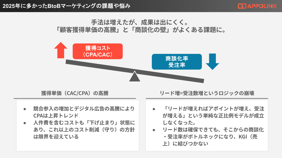 広告費の高騰、商談化率の低下、部門間の分断など、