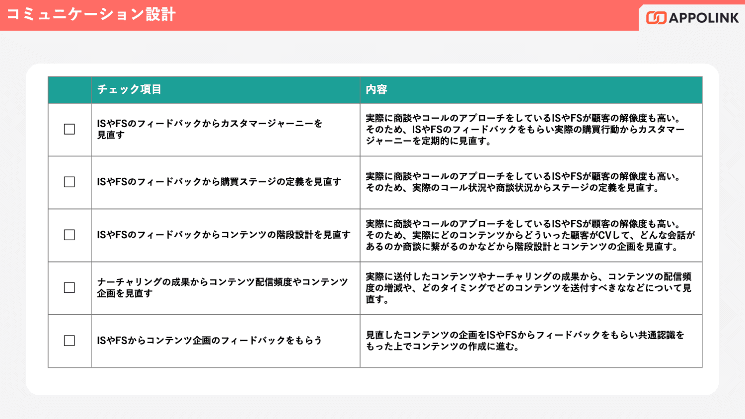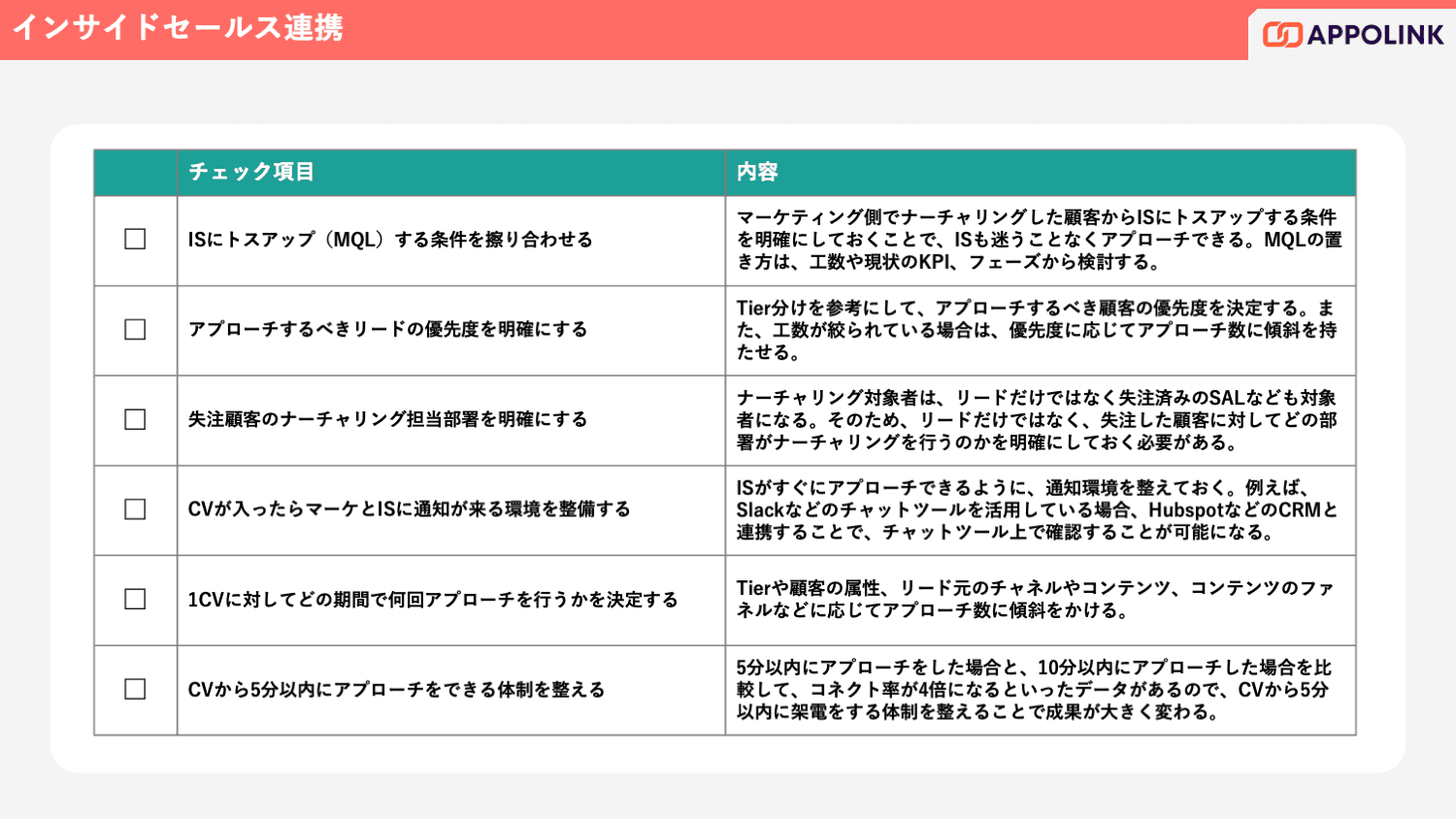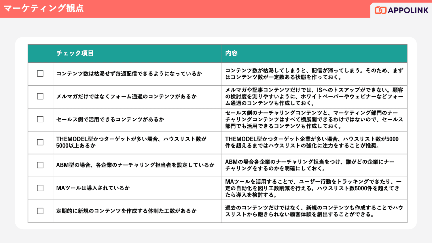 本資料では、ターゲット戦略の明確化、購買ステージに応じたコンテンツ設計、インサイドセールスとの連携強化など、ナーチャリング成果を最大化するための47項目のチェックシートを提供。