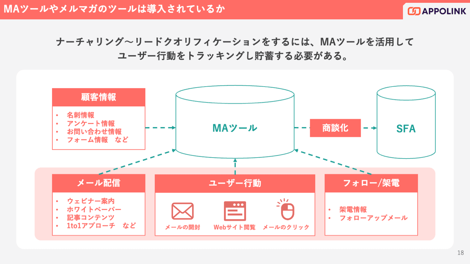本資料では、閲覧データのリアルタイム可視化・通知を実現するサービス「APPOLINK(アポリンク)」の主要機能をはじめ、営業・マーケティングでの具体的な活用シーン、導入企業の成果事例などをご紹介。