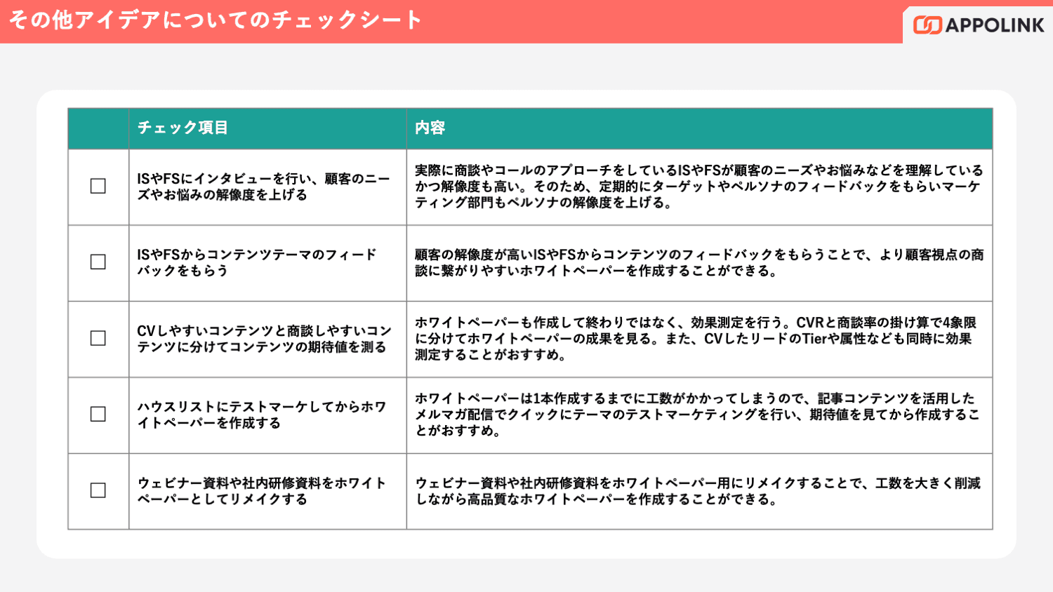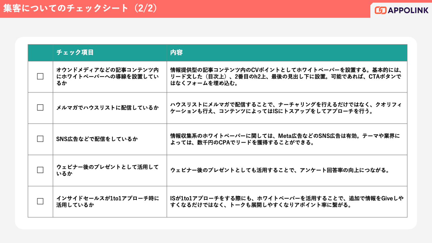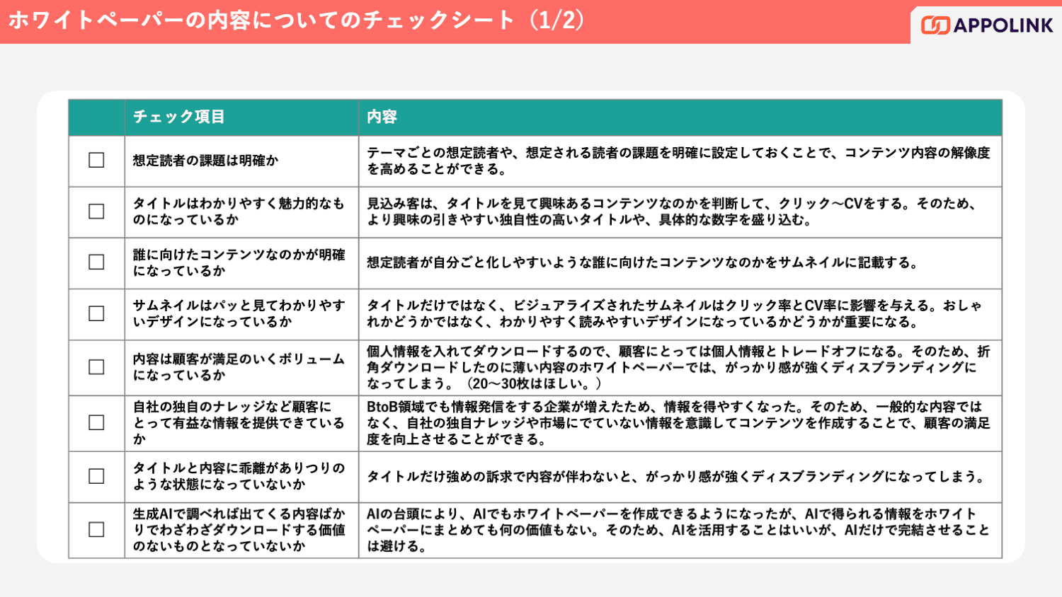 本資料では、「商談を生み出すホワイトペーパー」にするための40項目のチェックシートを用意。